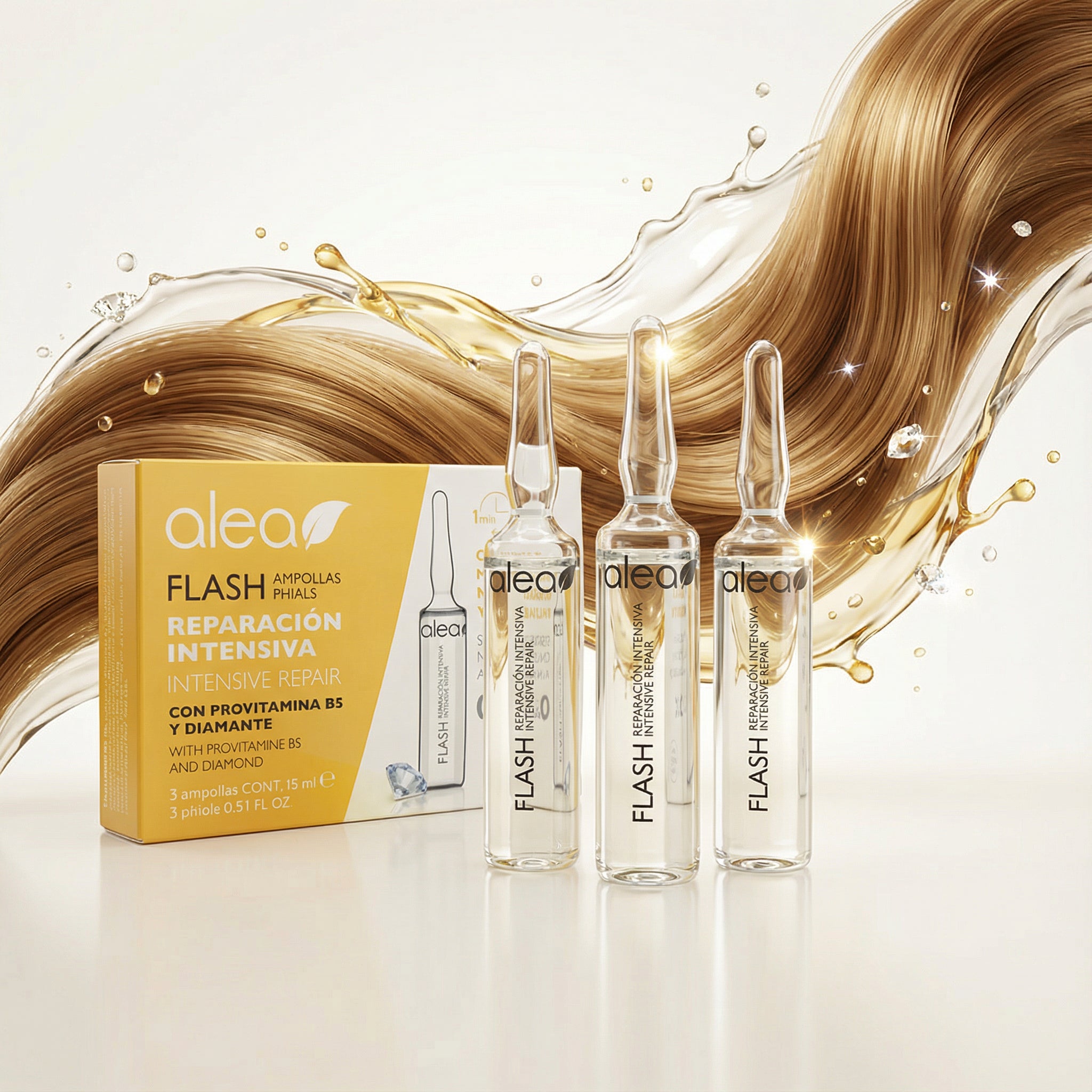 Tras un proceso químico, tu cabello necesita un rescate de emergencia. Las Ampolletas Flash de Reparación Intensiva actúan en solo 1 minuto. Su fórmula con Provitamina B5 y Diamante sella la hidratación y repara el daño acumulado de inmediato.